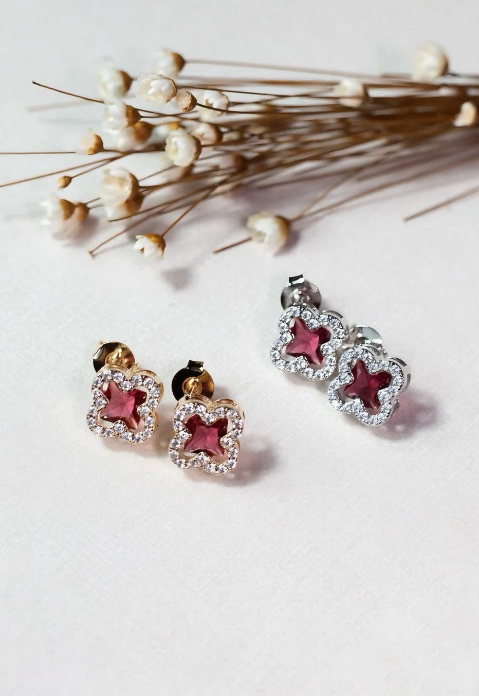 Brinco Trevo com Micro Zircônia Vermelho Rubi